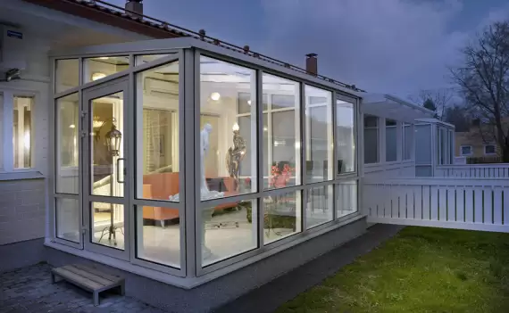 В деревне Таширово (Наро-Фоминский район, МО) реализовано тёплое остекление зимнего сада с использованием белого ПВХ-профиля Rehau и фурнитуры Roto NX. Установлено 14 конструкций, включая поворотно-откидные окна, глухие панели и остеклённые двери. Все элементы выполнены в белом цвете, без ламинации. Монтаж сопровождался полной герметизацией и установкой подставочных профилей.